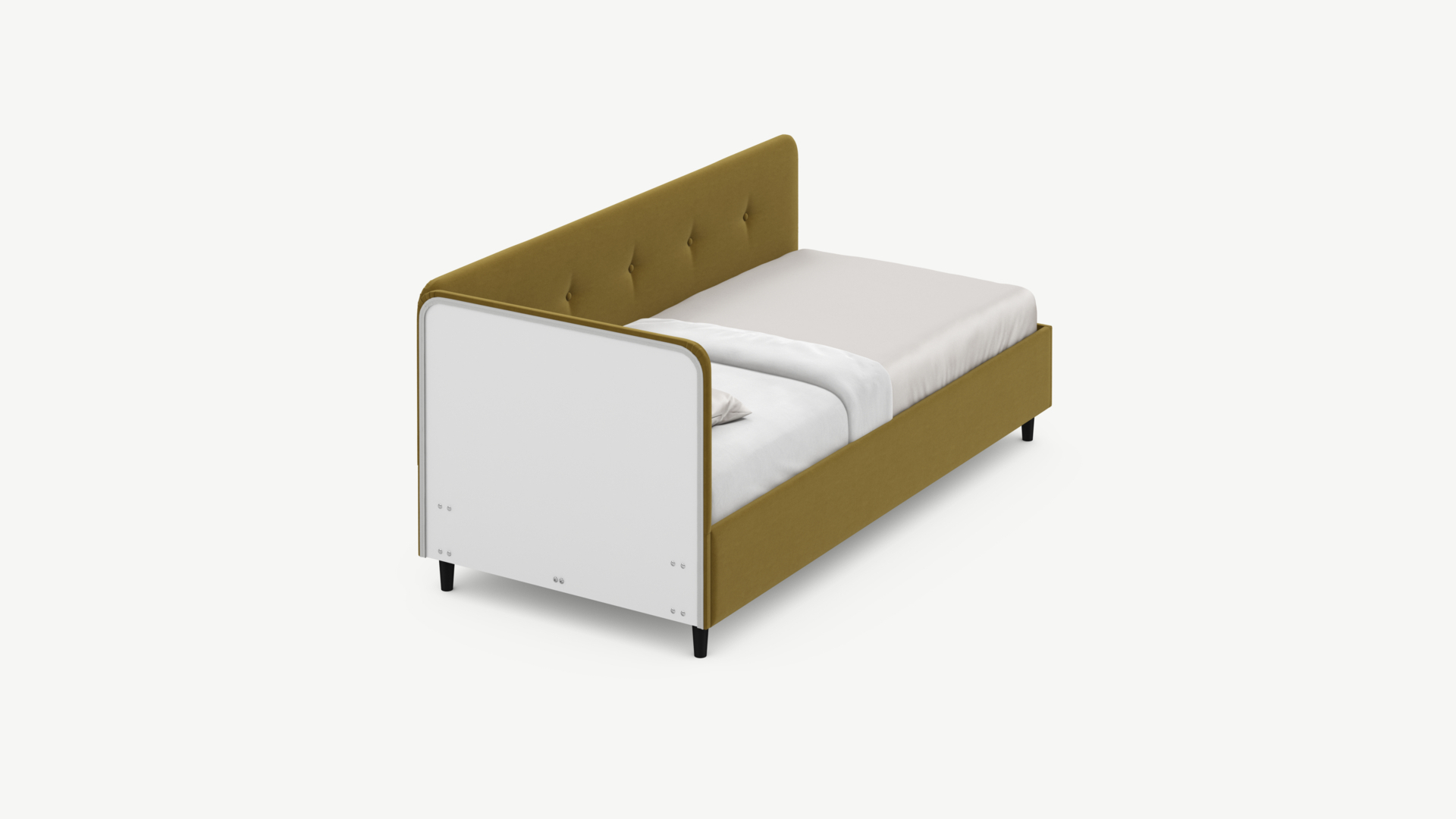Угловая односпальная кровать MOON FAMILY 1253 с мягкой спинкой и изголовьем обладает округлыми формами, привносящими в интерьер нотки нежности. Изголовье, украшенное пуговицами, добавляет окружающему пространству шарм и уют. Высокие опоры придают кровати визуальной легкости, а также обеспечивают удобство во время уборки.